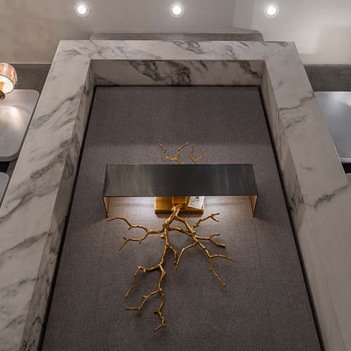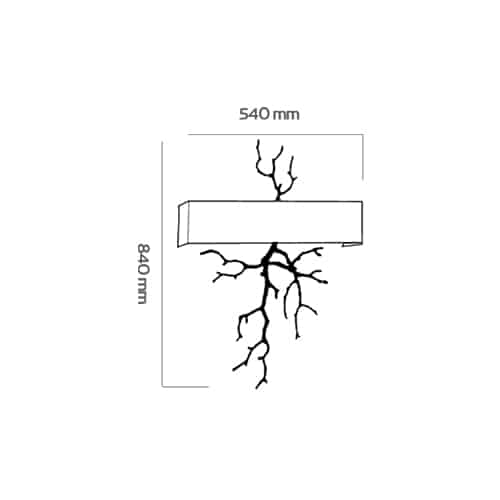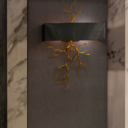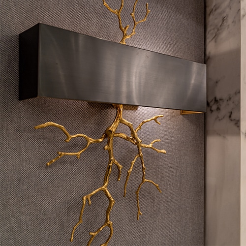 این دیوارکوب دو شعله بدنه‌ای از جنس آهن و به رنگ مشکی دارد که به وسیله آن بر روی دیوار نصب می‌شود. بدنه این دیوارکوب به قدری جذاب طراحی شده است که پس از نصب بر روی دیوار به شکلی بسیار زیبا روی آن نمود می‌کند گویی که از ابتدا و به صورت پیش فرض بر روی دیوار بوده باشد. در درون این بدنه آهنی و مشکی رنگ یک شاخه درخت از جنس برنج و با رنگ طلایی قرار داده شده که اوج زیبایی را برای این چراغ دیواری به وجود آورده است. علاوه بر این شاخه برنجی در درون همین بدنه دو لامپ وجود دارد که نور این چراغ دیواری توسط آن‌ها تامین می‌شود.